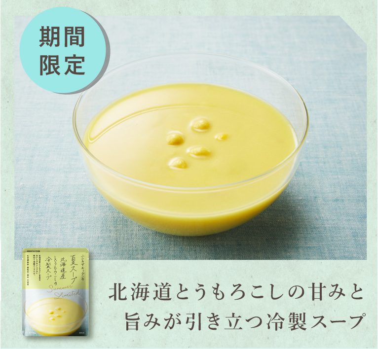 暑い季節にオススメしたい、北海道産とうもろこしのおいしさを味わう冷製スープ。とうもろこしは品質が落ちないように、収穫から24時間以内に加工・冷凍することで品質と新鮮なおいしさを保っています!ホールコーンのシャキシャキとした食感も楽しめるスープです◎