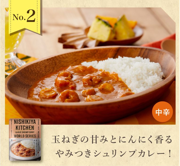 B級グルメとして愛される人気メニュー「ガーリックシュリンプ」をイメージした、えびの旨みがたっぷり溶け込んだ中辛カレー。じっくり炒めた玉ねぎとにんにくに、えびや食感の良いヤングコーンをプラス。パンチのあるにんにくの香りに思わず食欲をそそられます♪