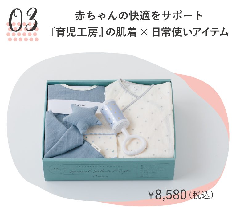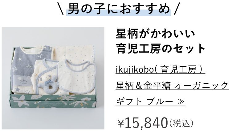 星柄の『育児工房』の中肌着に合わせて、星モチーフのスタイやガラガラをセレクト。生まれたばかりの赤ちゃんのお世話にすぐ使えるギフトセットです。