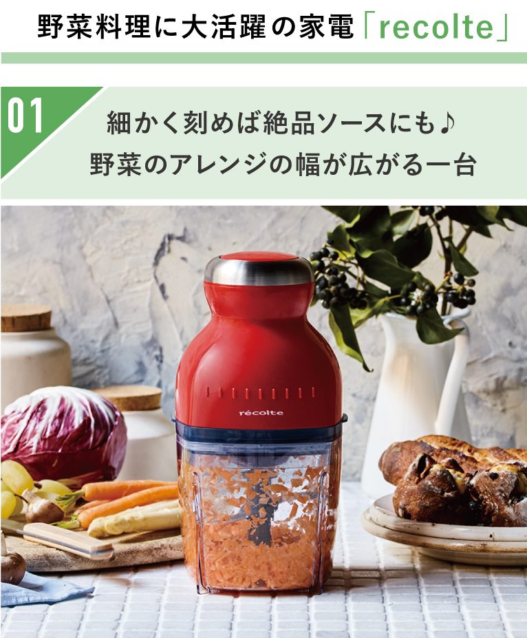 野菜料理の幅が広がる「recolte(レコルト)」のキッチン家電やあっという間に下ごしらえができる便利アイテム、野菜の美味しさを引き出す絶品ドレッシングなど、毎日の料理に役立つおすすめアイテムをご紹介します!