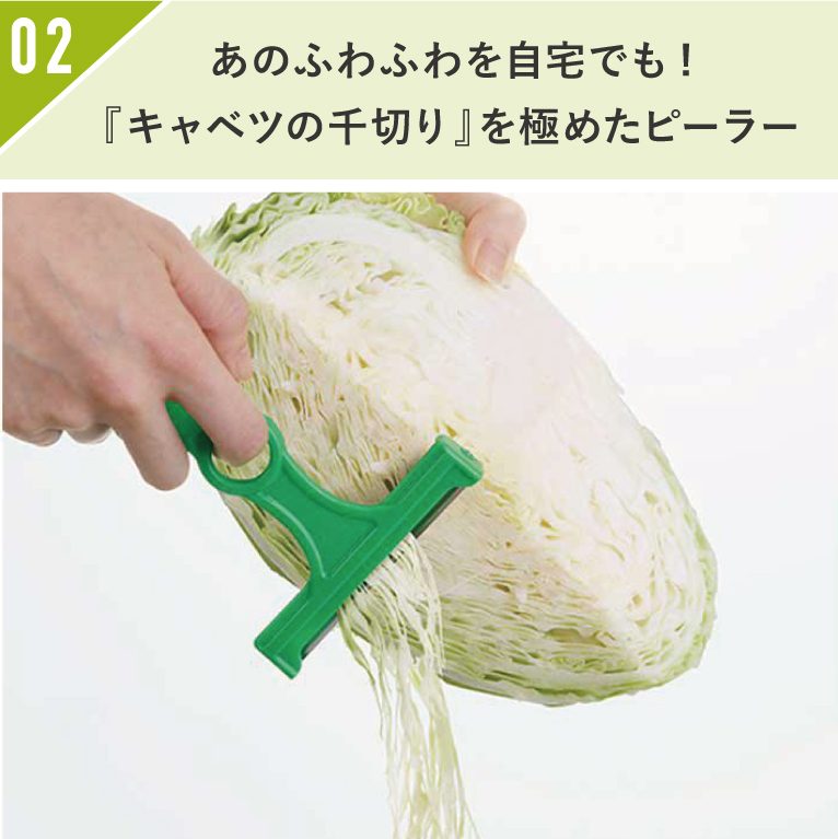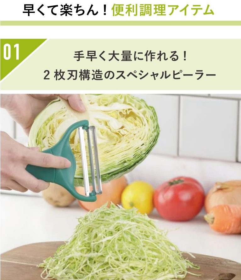 キャベツ以外にもきゅうりやなす、根菜類も薄くスライスができ、調理がはかどる時短アイテムです。