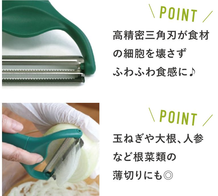 三角刃で削ることで断面が波状になり、ドレッシングなどの味が染みこみやすくなるのも特長です。キャベツだけでなく、大根、人参、玉ねぎなどのスライスにもおすすめです◎