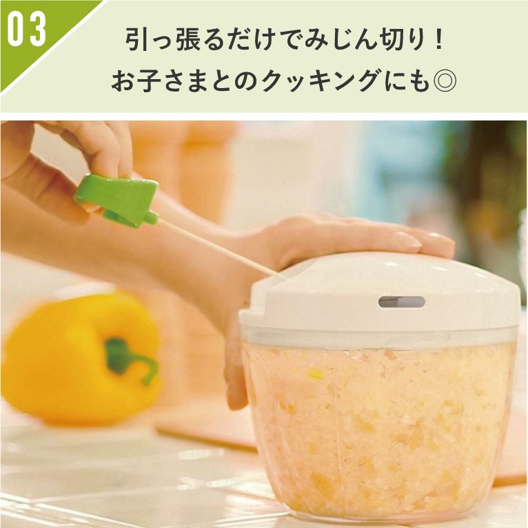 刃を回転させる回数で、仕上がりは粗みじんから細みじんまでお好みで調整可能です!水洗い出来るのでお手入れもカンタン♪
