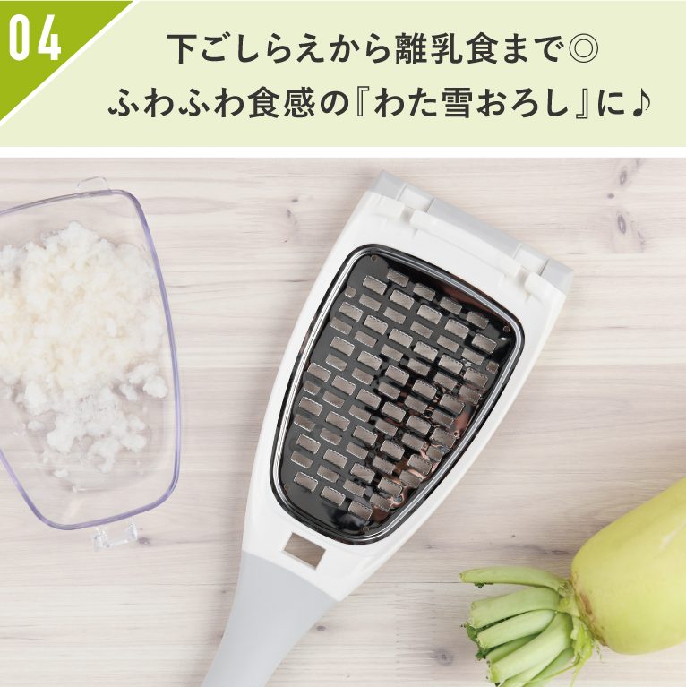 大根以外にも、人参、長芋、りんごなど、様々な食材のすりおろしに。離乳食や介護食の下ごしらえにも便利です◎