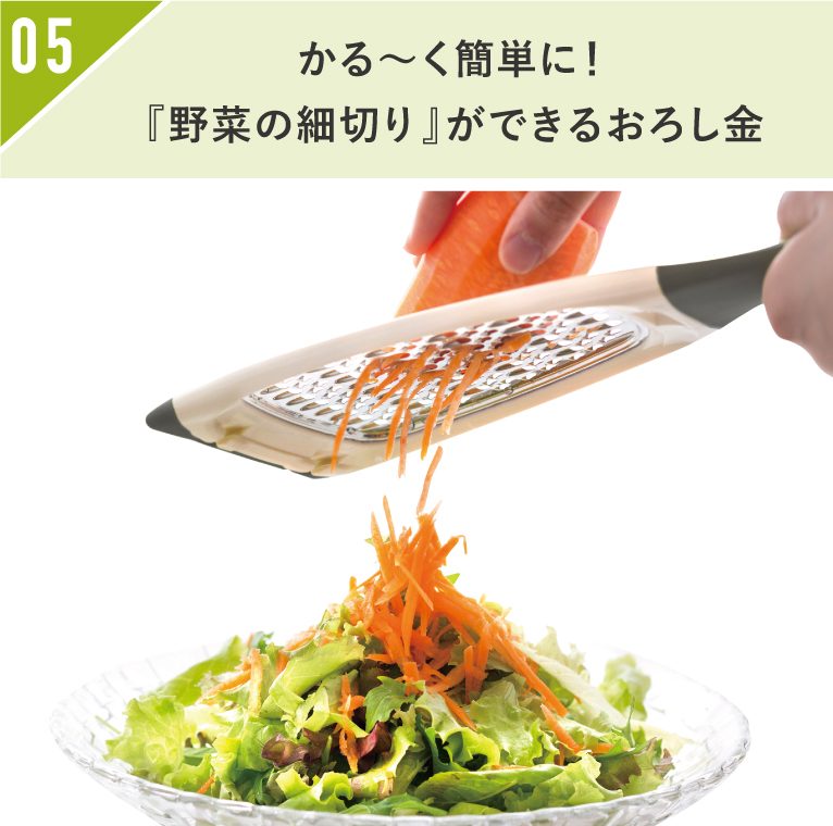 「簡単に」「非常に軽い力で」「短時間に」味馴染みの良い野菜の細切りができる新型おろし金。余分な力を入れずに食材を押さえて上下するだけで、適度な噛みごたえのある細切りができます。