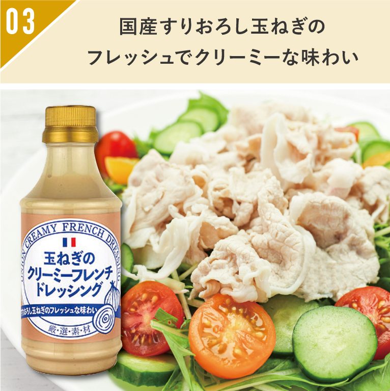 国産すりおろし玉ねぎを贅沢に使ったドレッシング。野菜の旨味がしっかり引き出されたフレッシュな味わいです。