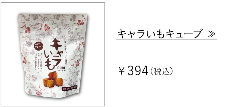 カリッと揚げた芋をキャラメルコーティングして焼き上げた「キャラいも」。南九州産のさつまいもを皮ごと使っており、香料、保存料、着色料不使用でからだにやさしく、お子様にも人気です。