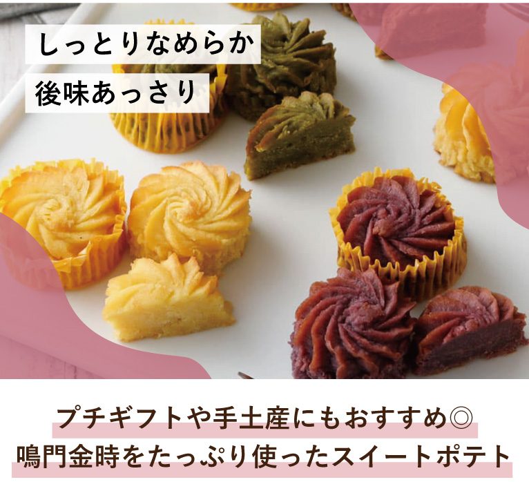 「鳴門金時」をたっぷり使って焼きあげたスイートポテト。さつまいもの美味しさを最大限にいかせるようシンプルな原材料で作られています。さつまいもの風味と上品な甘味が特徴です。