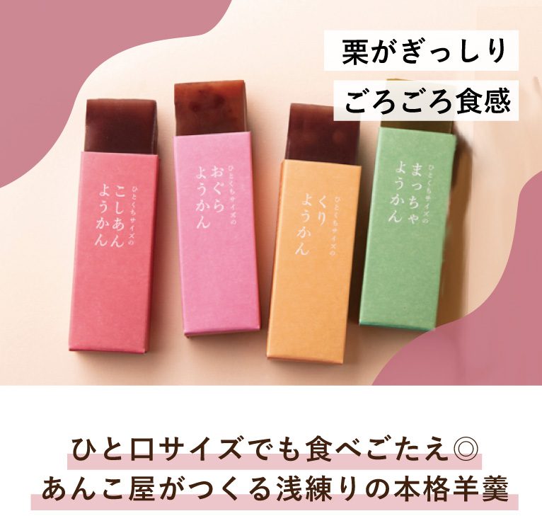 あんこ屋がつくる、ひと口サイズの本格羊羹。浅練りで甘さが後に残らないすっきりとした口当たりです。