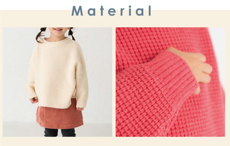 凹凸のある立体的な編み目のニットは、レーヨンとポリエステルをミックスした素材を使用。柔らかくてふんわりとした肌ざわり♪着心地にもきちんとこだわりました。