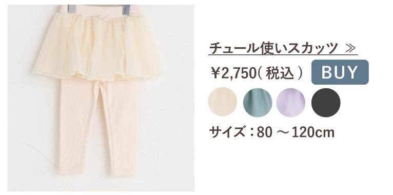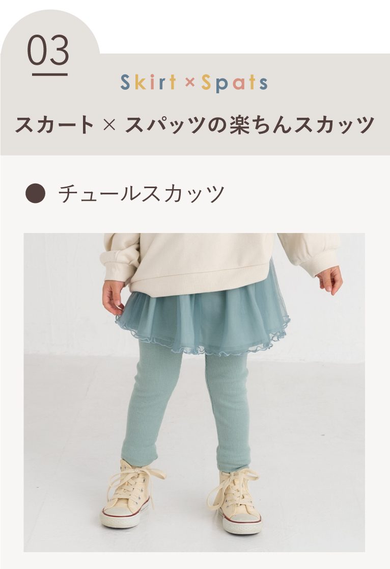 女の子らしいシルエットの『チュールスカッツ』。ふんわり広がるチュールがまるでパニエのような1枚♪リブレギンス付きなので、動き回る女の子にもぴったり!