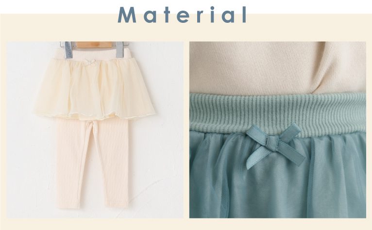 スカート部分はふんわり軽やかなチュール素材。レギンス部分は心地よいフィット感のあるリブ素材。ほどよい厚みがあり、しっかりストレッチします。ウエストはゴム仕様で、センターにさりげなくリボンが付いているのもポイント◎