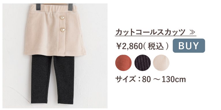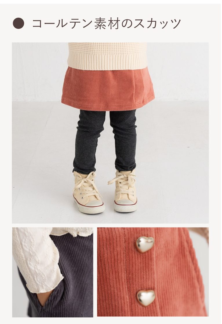 女の子の理想を叶えた無地の『カットコールスカッツ』。スカートを履きたいけどめいっぱい遊びたい女の子へ、ポケットやレギンスなど機能性にもこだわったスカッツです。ベーシックなデザインなのでどんなスタイルにもぴったりです。女の子が大好き!ハートのチャームもデザインのポイント♪素材は動きにフィットするストレッチ素材を使用。厚みがありながら柔らかな生地で、ふんわりとした履き心地です。