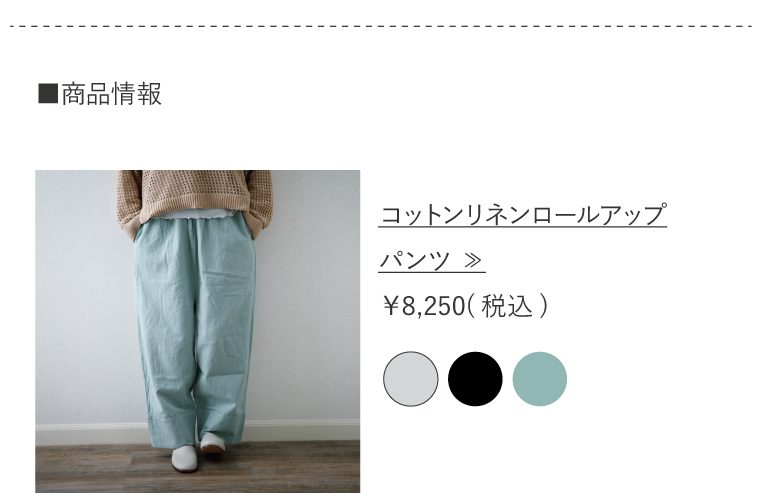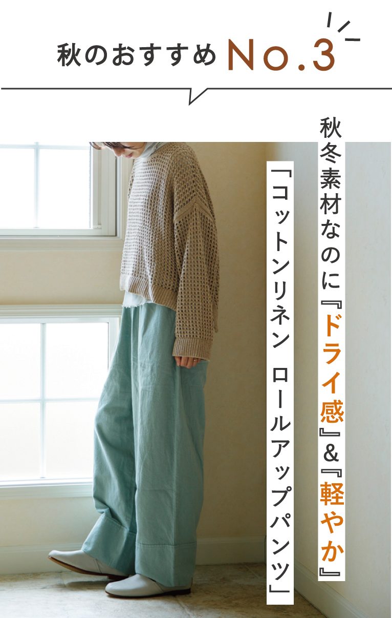 初秋にぜひ取り入れたい!麻のドライ感と、生地表面の起毛によって表情のあるふんわり柔らかい肌触りを兼ね備えたコットンリネンロールアップパンツ。カラーは今年注目のミントグリーンや着回しのきくアイスグレー、ブラックの3色展開。ストンと落ちるシルエットが可愛く、ニットやスウェットなどと相性抜群です。