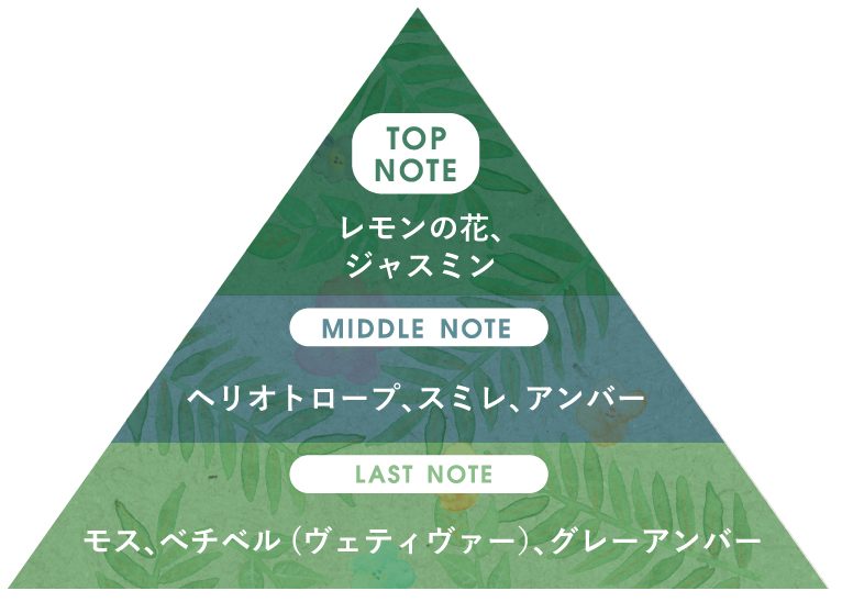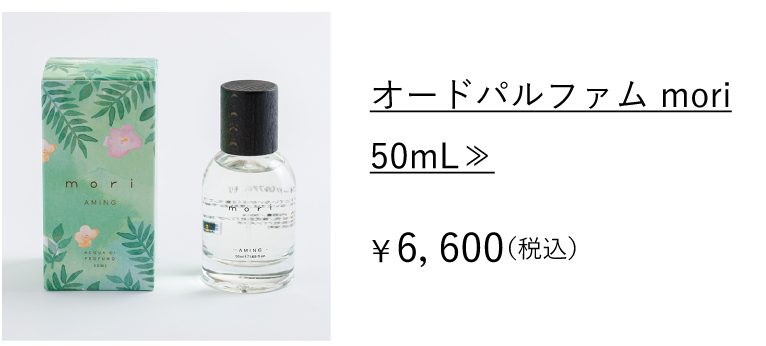 『mori=森』の名のとおり、目を閉じれば、深い森の奥の木々や花々たちに身を預け守られているかのように心が落ち着く、優美で奥深く洗練された香り。