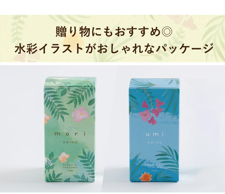 アミング初のオリジナルフレグランスで大好評の「mori」がリニューアル!香りはそのまま、使っている成分がよりやさしいものになりました。そして、新作の「umi」が登場!イタリア最大級のオーガニック認証機関『AIAB』の認証を取得している日本でも数少ないオーガニックフレグランスです。