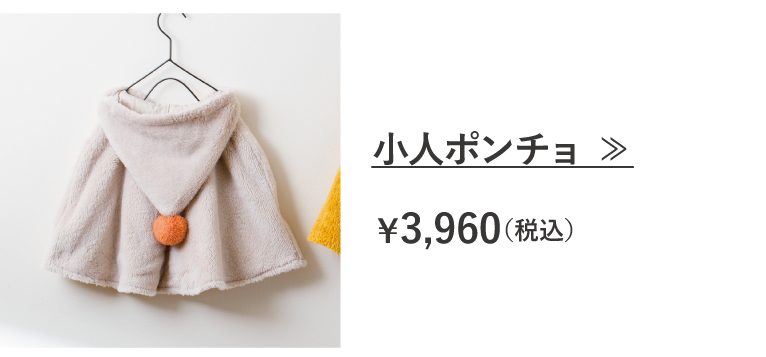 配色がおしゃれなフードをかぶれば、思わず抱きしめたくなるキュートな小人に大変身!「ポンチョ」&「ジャンプスーツ」の帽子にはボンボン付きです。裏地はカットソー素材で肌あたりがやさしいのも◎