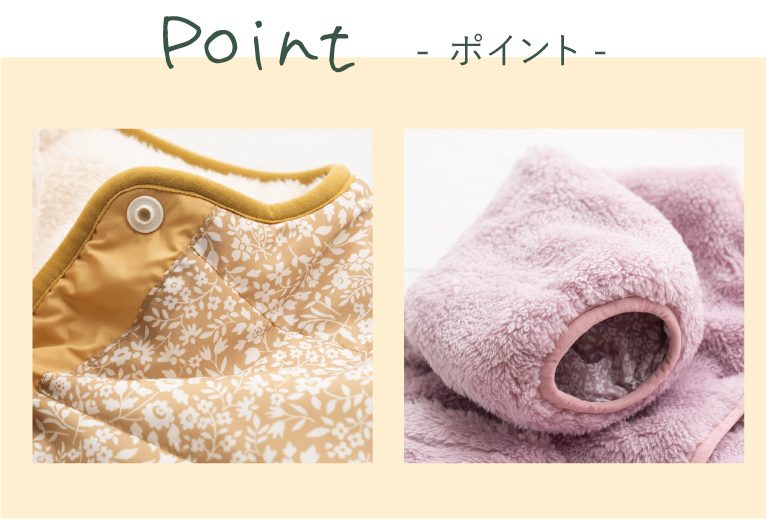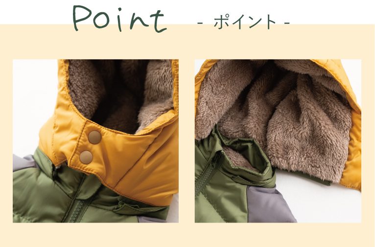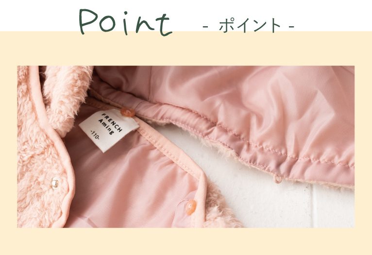裏地はあたたかいボア素材。ボタン付きの帽子で、顔周りをすっぽり包みます。寒いときは帽子であたたかく、遊ぶときは取り外して身軽に。シーンに合わせて使えるのも◎