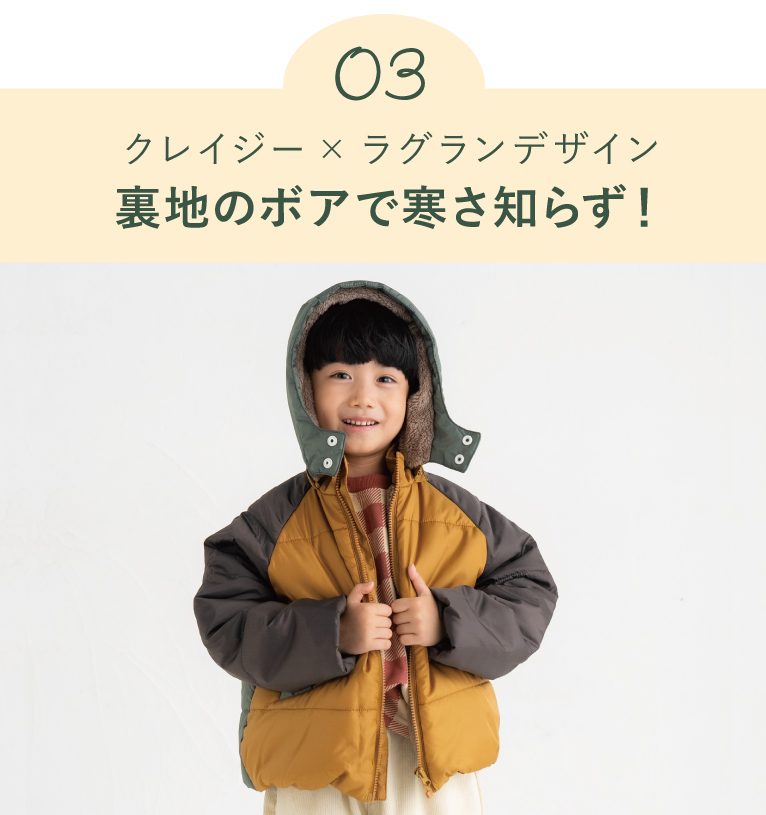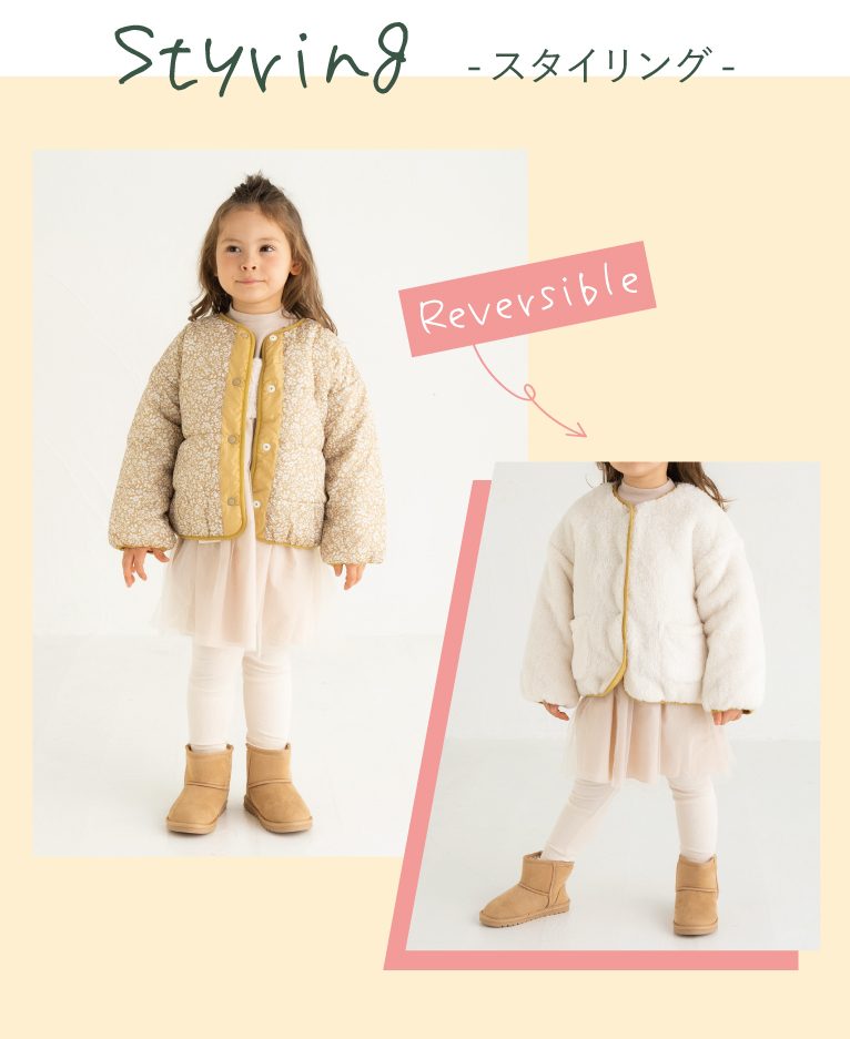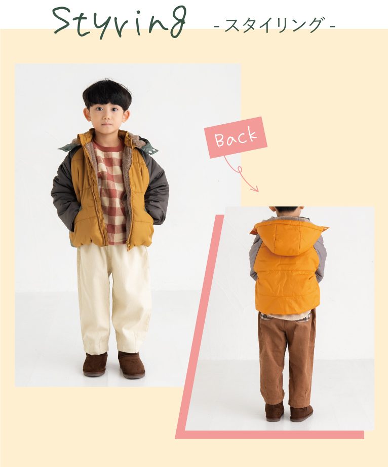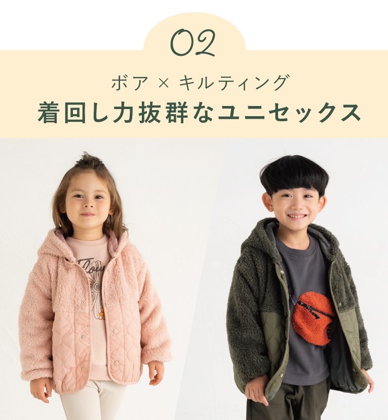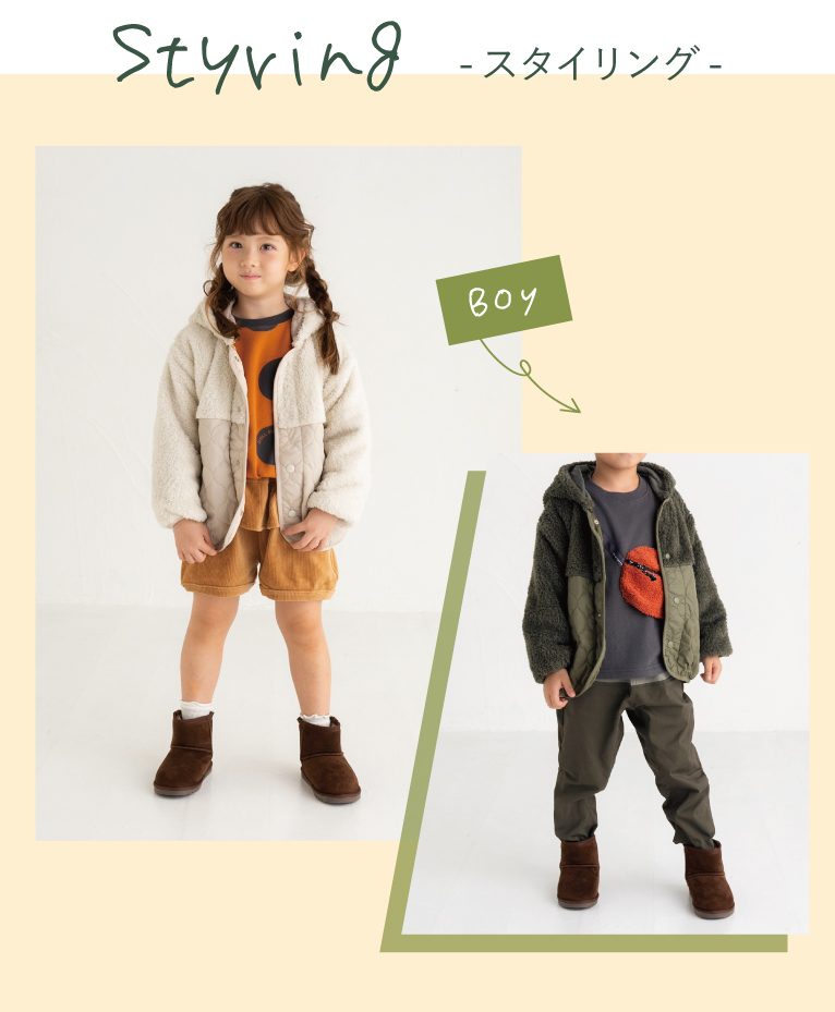 ナイロンのキルティング×ボアの切り替えデザインが今ドキ。ユニセックスなデザインなので兄弟姉妹でのリンクコーデにもおすすめ◎