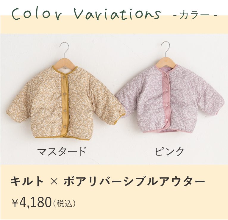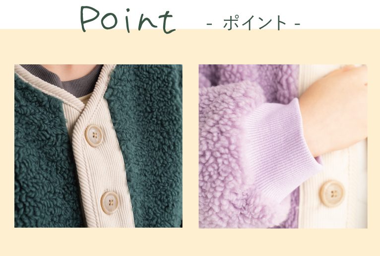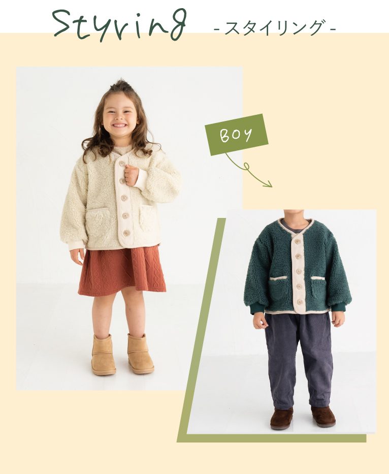 柔らかなボアとシーズン感満載のコーデュロイでワンランク上の仕上がりに。袖口はリブ仕様で冷気が入るのを防ぎます。大きめのボタンで着脱をお助け!お子様にもママにもうれしい仕様です。