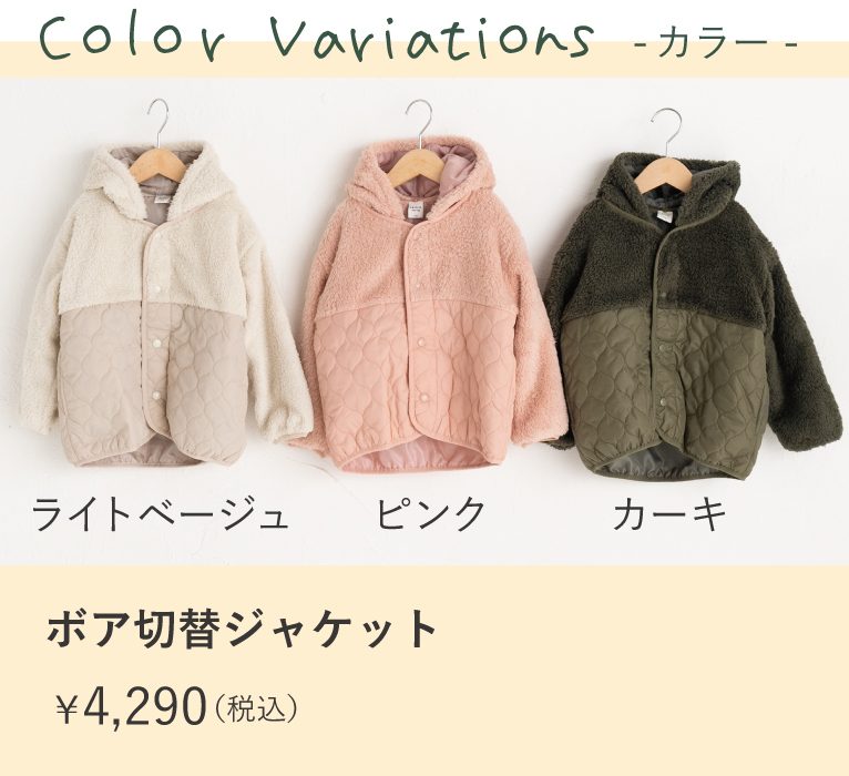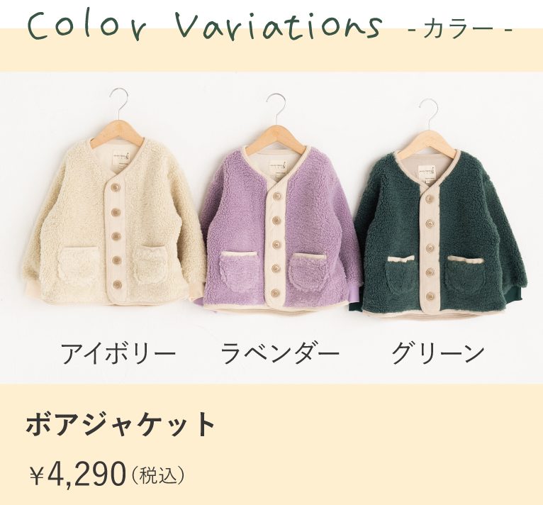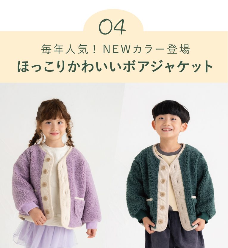 毎年人気のボアジャケット!アイボリーに続き、女の子が大好きなパープルと男の子も着やすいグリーンカラーが登場♪ころんとしたキュートなシルエットとポコポコしたボアがかわいいアウターです。