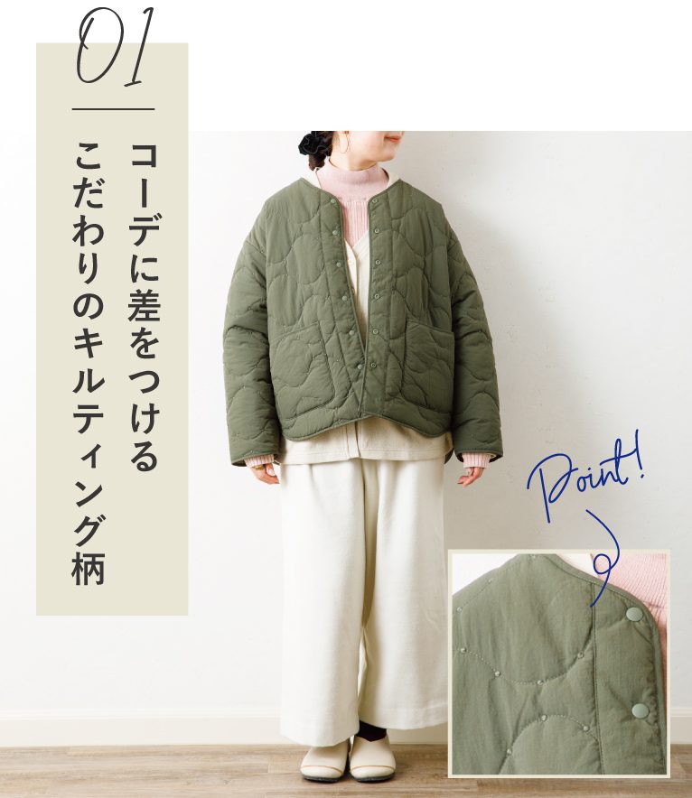 ドットを散りばめたような刺繍デザインがさりげなくおしゃれ。すっきりとしたノーカラーは襟付きのトップスとも相性抜群です。どんな装いにも合わせやすいカラーをセレクトしているのがうれしいポイント。トップのボタンをとめたりファスナーを開いたり、気分に合わせて着こなしをお楽しみください。