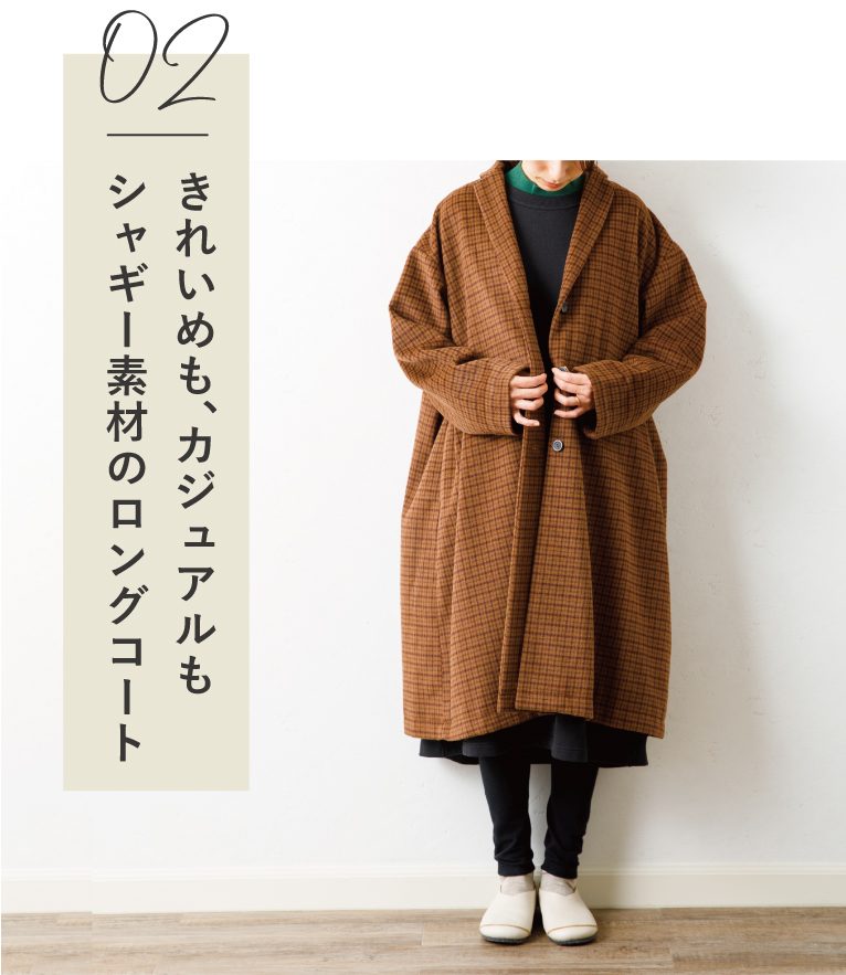耐久性の高いポリエステル生地を使用した、あたたかみのある長い毛足が特徴のシャギー素材のロングコート。脇にタックを入れ、緩やかなフィット感&フレアのシルエットで、きれいめにもカジュアルにも着こなせます。