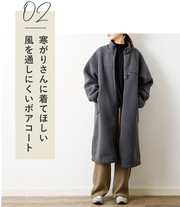 『Gymphlex(ジムフレックス)』のボアコート。表地は非常に柔らかく軽さが特徴のジムフレックスオリジナル生地“COZY LIGHT BOA”を使用し、風を通しにくいリップストップナイロンを裏地に使用することで、軽くてあたたかいボアブルゾンに仕上げています。ダブルジップになっており、閉め方によって様々な着こなしを楽しめます。