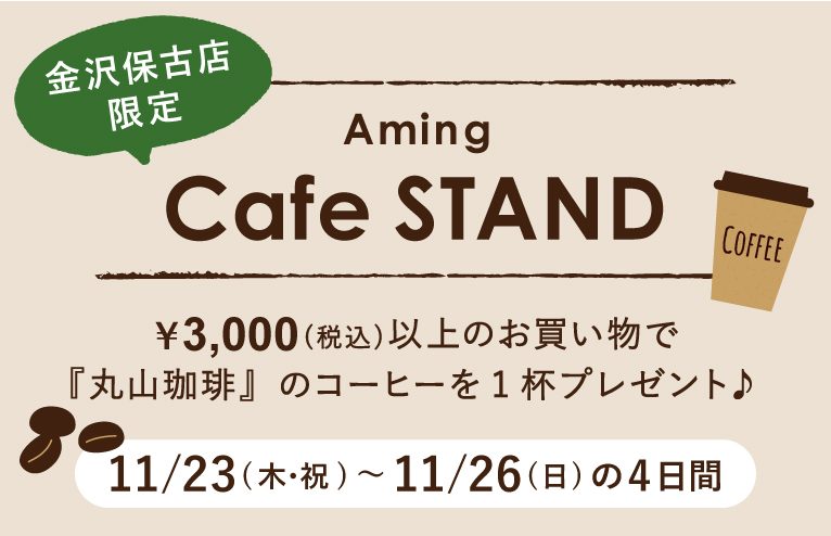 11月23日(木・祝)~11月26日(日)の4日間、金沢保古店にて¥3,000(税込)以上のお買い物で、スペシャルティコーヒー専門店『丸山珈琲』のコーヒーを1杯プレゼント!