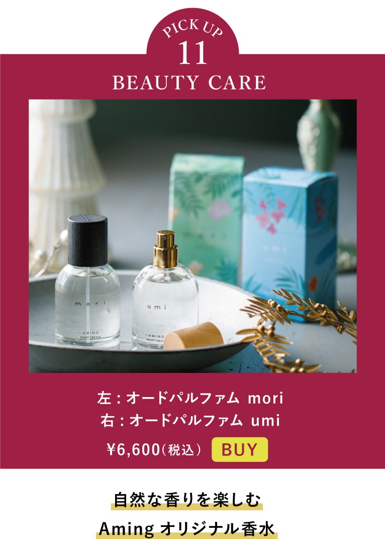 イタリア最大級のオーガニック認証機関『AIAB』の認証を取得している日本でも数少ないオーガニックフレグランス。その名の通り「mori」は森、「umi」は海の美しい自然をイメージした香りで、香水が苦手な方、香水を付けたことがない方にもおすすめしたいアイテムです。