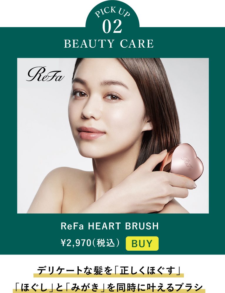 かわいらしさと握りやすさを考えた、ハート形がおしゃれなReFa(リファ)のブラシ。3段構造のピンがあらゆる角度から髪のからまりをキャッチ。ダメージを与えずにやさしく髪をほぐし、表面をなでるようにブラッシングすることで、キューティクルの広がりを抑えて指通りなめらかなツヤ髪にしてくれます。