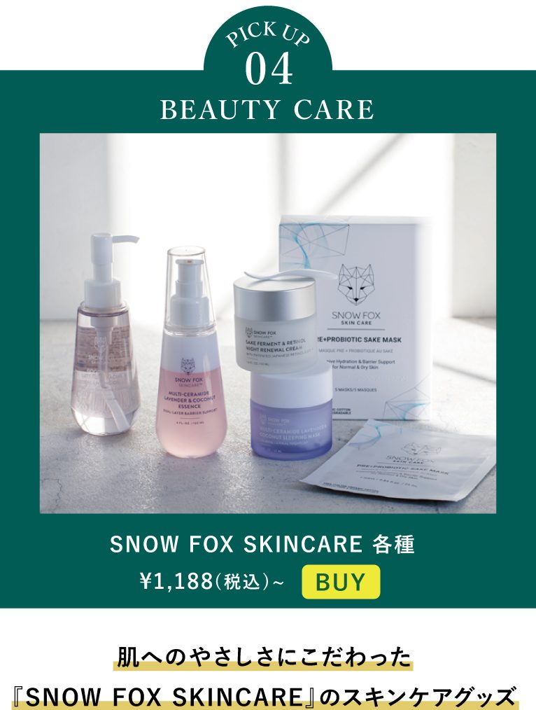 東洋のハーブの概念を取り入れたブランドSNOW FOX SKINCARE(スノーフォックススキンケア)のスキンケアグッズ。どのアイテムも合成保存料・合成着色料・合成香料不使用です。化粧水・乳液・美容液の3つの機能をしてくれるエッセンスや眠っている間に肌を乾燥から守ってくれるマスクなど、忙しい中でも使いやすいアイテムが揃っています。