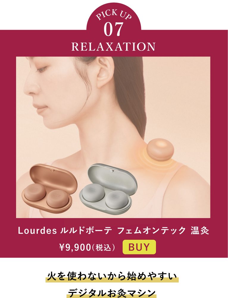 充電式で簡単にお灸ができるグッズです。管理医療機器として認可されていて血行をよくしてくれる効果があります。お好みに合わせて3段階の温度の切り替えが可能。体にしっかり固定できる粘着シールは無香とよもぎの香りの2タイプセット。使う箇所や気分によって使い分けできます。シールは追加購入も可能です。