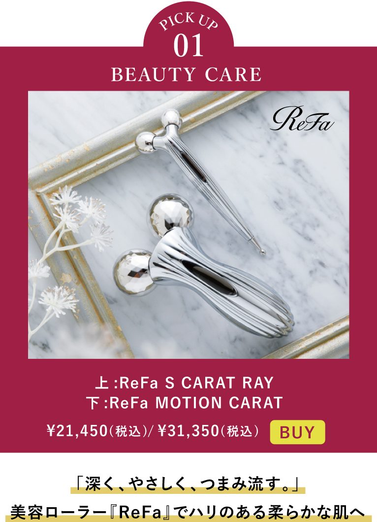 数多くのメディアで紹介され、性別問わず大人気!ReFa(リファ)の美容ローラー。微弱電流「マイクロカレント」を発生させるのと同時にローラーが肌をつまみ流し、きめ細かい肌に整えてくれます。目元・口元などのポイントケアにぴったりの「ReFa S CARAT RAY」と、顔はもちろんボディケアにも使用できる「ReFa MOTION CARAT」。バスタイムにも使用できる嬉しい防水仕様です。