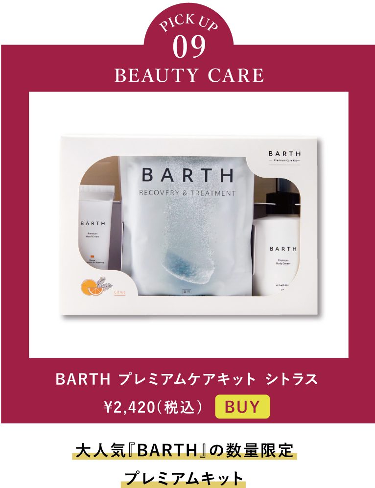 「薬用BARTH中性重炭酸入浴剤」とお試し用の「プレミアムボディクリーム」、「プレミアムハンドクリーム」の3つがセットになったプレミアムキット!爽やかな柑橘系の香りがケアの時間を心地良くしてくれます。BARTH(バース)を試してみたい方にぴったりのアイテムです。