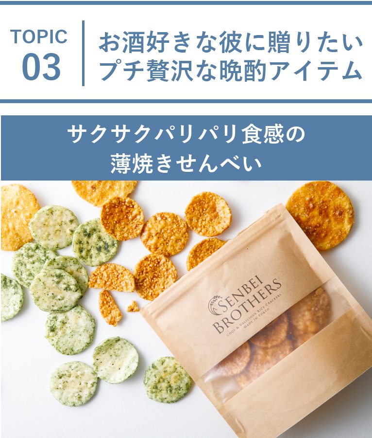 「せんべいを、おいしく、かっこよく」。「シンプル・イズ・ベスト」をベースに、デザインも、コスト面も無駄も省いてシンプルに。米の甘さと香りも感じられ、飽きのこないおいしさのせんべいです。おつまみにも◎