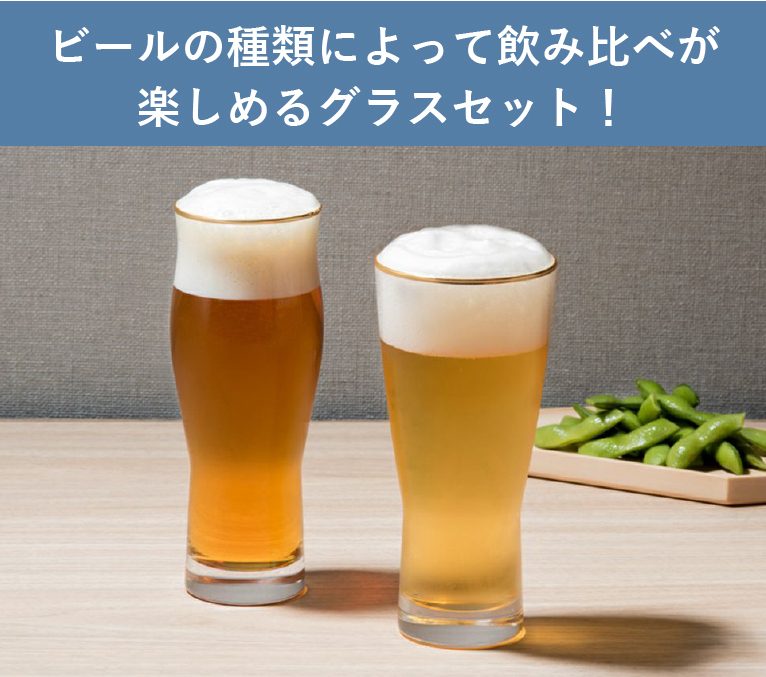 ビールの種類によって飲み比べができるグラスのセット。背の低いのど越しグラスはドライ系ビールがおすすめ。ビールの爽快なのど越しをさらにお楽しみいただけます。背の高い口あたりグラスはプレミアムビールがおすすめ。ビール特有の口あたりをより一層ご堪能いただけます。木箱入りでギフトにもおすすめです。