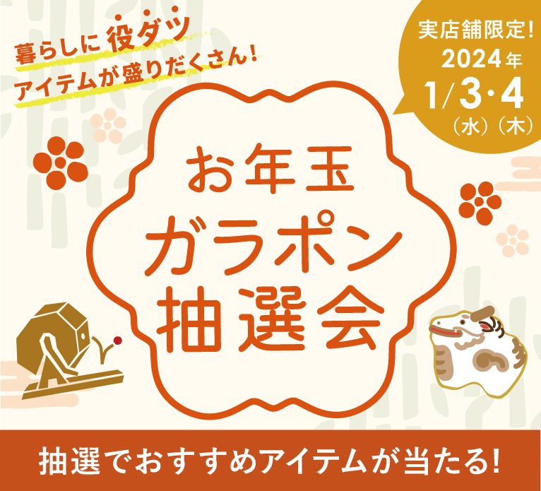 1月3日(水)・4日(木)の期間中、幸運を運ぶと言われる辰年にちなんで、暮らしに役ダツアイテムが当たる!ガラポン抽選会を開催いたします。