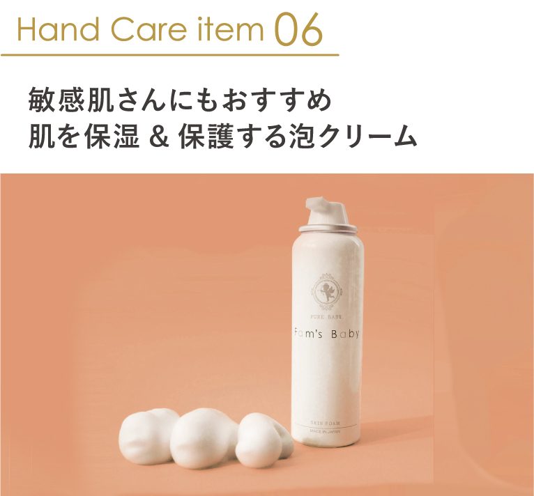 モコモコの濃密泡で肌を保湿&保護してくれる「ファムズベビー」の泡クリーム。香料、着色料、パラベンを含まない低刺激処方で、ハンドケアはもちろん全身のケアとしても大活躍!保湿と同時に、皮膚の上にバリア層を作って肌を保護する撥水性で、1度塗ると手を洗っても汗をかいても約8時間バリア機能が続きます。忙しくてなかなか塗り直しができない方や家族で使えるアイテムを探している方におすすめです。