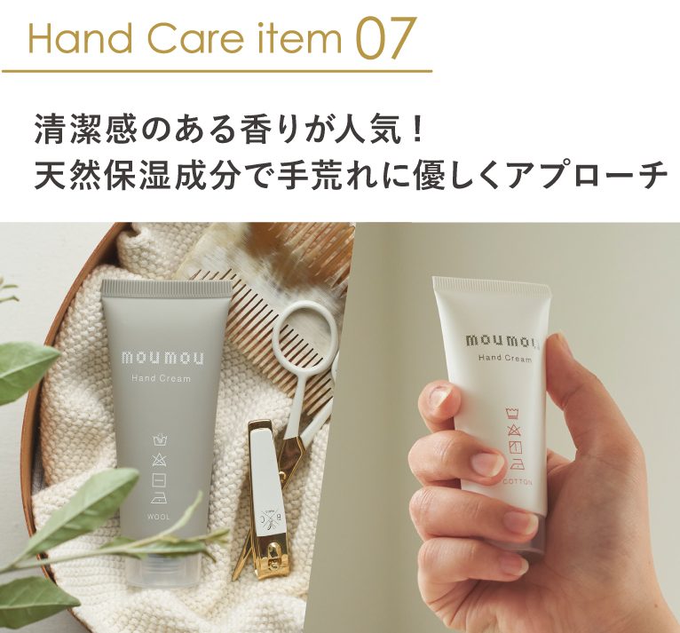「コットンの香り」「リネンの香り」など、清潔感のある香りが人気のブランド『mou mou(ムームー)』のハンドクリーム。男性でも使いやすい優しい香りで、シンプルなパッケージはギフトにもおすすめ。シアバター・ホホバオイル・アーモンドオイルなど、天然保湿成分を贅沢に配合し、さらっとしたつけ心地です。