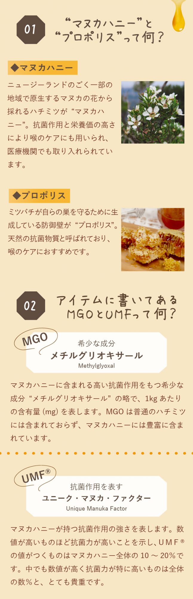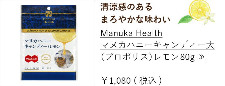MGO400のマヌカハニー&プロポリスを配合した本格派のマヌカハニーキャンディです。美味しく健康なからだづくりをサポート!レモンフレーバーは清涼感のあるまろやかな味わいが広がります。「マヌカハニーを試してみたいけど、どれを買えば良いか分からない…」というマヌカハニー初心者の方におすすめのアイテムです。