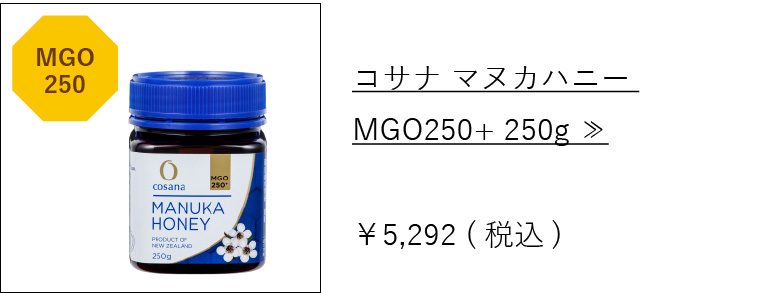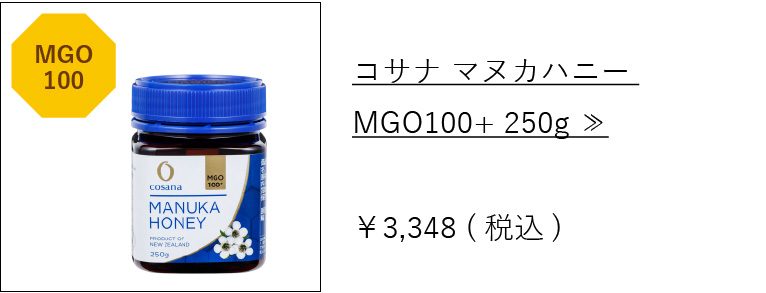 一日一回スプーン一杯をそのままなめるのはもちろん、トーストに塗ったりお好きなお飲み物に混ぜたりしてお召し上がりいただけます。「MGO100+」「MGO250+」の2種類あり、MGOの量でお選びいただけます。