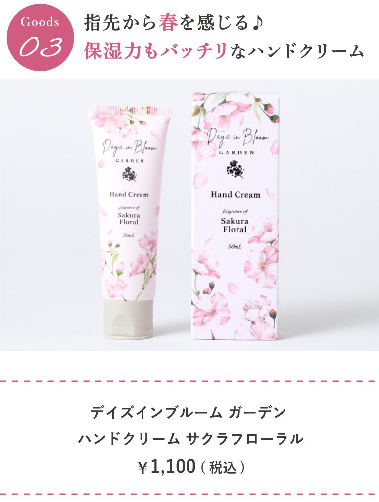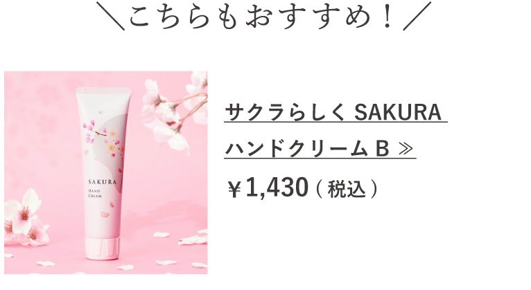 やわらかなサクラフローラルの香りとうるおいに包まれる手肌に。シアバター5種の植物オイル、ソメイヨシノ葉エキスを贅沢に配合。しっかりと保湿しながら、なめらかな手肌に整えます。コクのあるリッチなテクスチャーながらなじみがよく、さらりとした仕上がりに。
