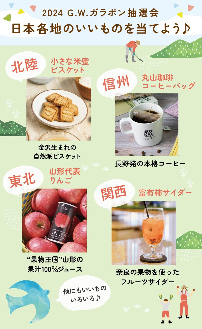 5/3(金・祝)・5/4(土・祝)は、¥3,000(税込)ご購入ごとにガラポン抽選会にチャレンジしていただけます。ご当地素材を使ったお菓子やジュースなど、日本各地のいいものが当たるチャンス!