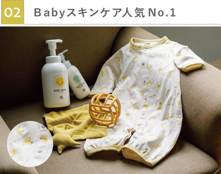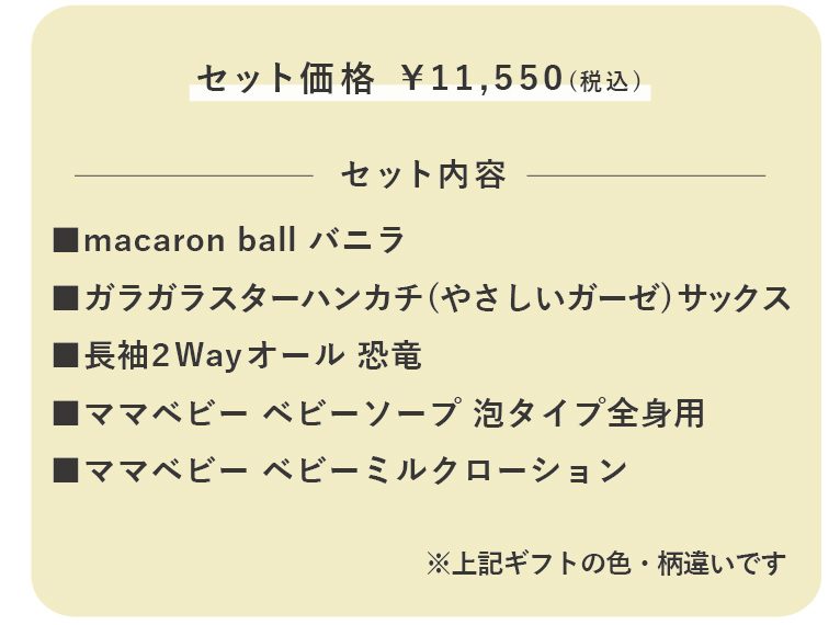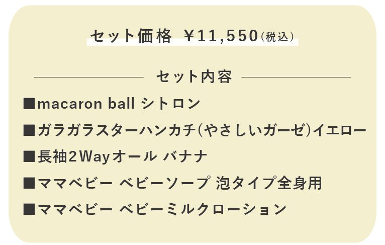 バナナ柄がとっても可愛い2Wayオールと赤ちゃんの初めてのおもちゃにおすすめのアイテムをプラスしたギフトセット。オーガニックスキンケアブランド「ママベビー」の泡タイプベビーソープとミルキーローションは、赤ちゃんにとって大切な毎日のスキンケアにおすすめ!赤ちゃんと一緒にママのスキンケアにも◎