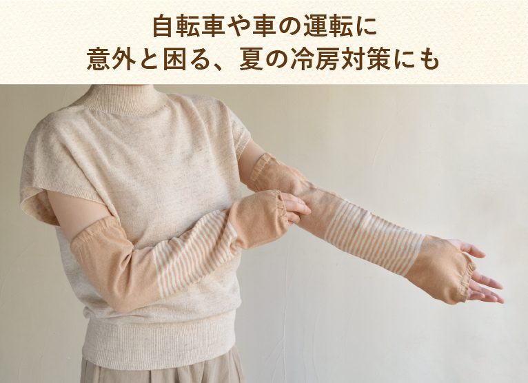 汗をかいても肌にまとわりつかない、薄手のふんわりとしたアームカバーです。ゆったり幅広で蒸れにくく、締め付けない着け心地にこだわっています。