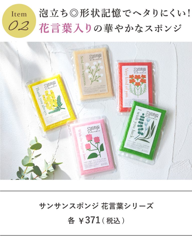花言葉をラベルに採用した可愛いカラーのスポンジ。高品質のポリウレタンを使用しているので、高い形状記憶でヘタりにくく、新品のようなフォルムが長持ちします。泡立ちのよさと水切れのよさを両立し、汚れをスムーズに落とします。