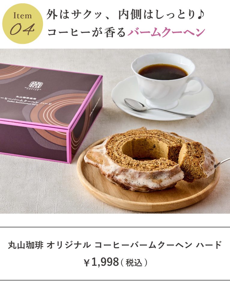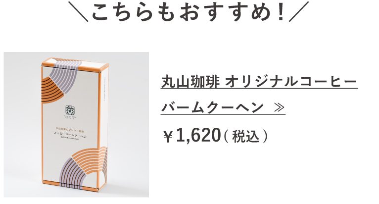 丸山珈琲のブレンドを濃縮したコーヒーとエスプレッソ中深煎りブレンドの粉を贅沢に使用し、コーヒーのシュガーコーティングをした丸山珈琲オリジナルのバームクーヘン。一口食べるたびにコーヒーの豊かな香りが口の中に広がります♪