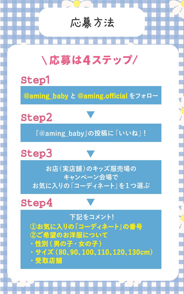 インスタグラムで『@aming_baby』 と『@aming.official』 の公式アカウントをフォローし、『@aming_baby』のキャンペーン投稿に「いいね!」&店頭で開催の人気投票に参加していただいた方の中から抽選で50名様にFRENCH Amingのお洋服を1点プレゼント!