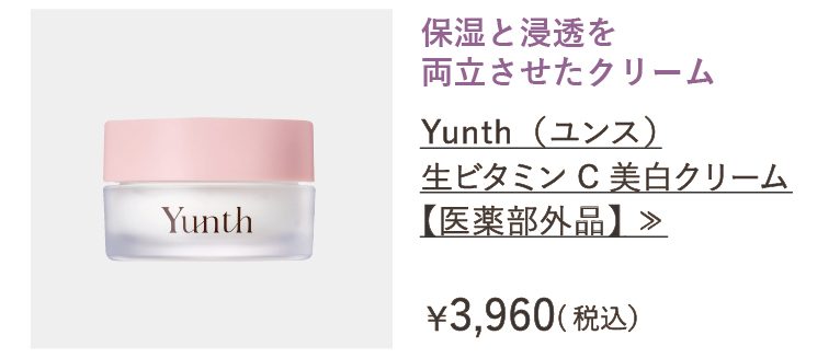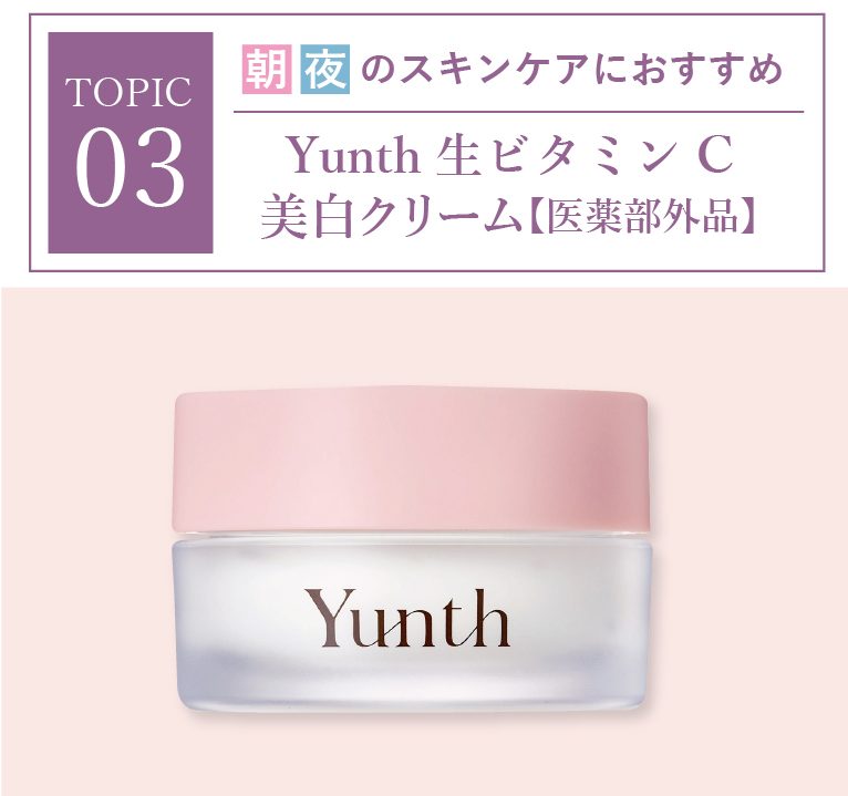 美白(※1)美容液の後に化粧水やフェイスマスクで保湿をして、最後は『Yunth生ビタミンC美白クリーム』でスキンケア終了!Yunthのクリームはべたつかず馴染みやすいので、夏でも心地良く使えるのが◎朝晩通して使いやすいクリームです。